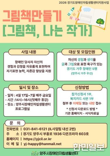 한민일보 서울포커스 임경복 기자 | 양주시장애인자립생활센터에서는 장애인의 문화·예술 참여 기회를 확대하고 자기 표현의 장을 마련하기 위해 그림책 만들기[그림책, 나는 작가] 참가자를 모집한다.