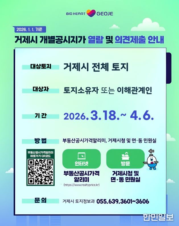 한민일보 서울포커스 김은금 기자 | 거제시는 2026년 1월 1일 기준 개별공시지가(안)에 대하여 3월 18일부터 4월 6일까지 열람 및 의견을 접수한다고 밝혔다.