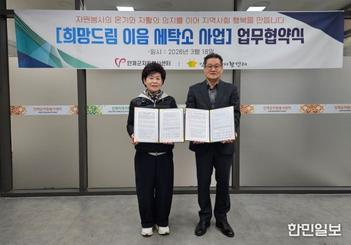 인제군자원봉사센터와 인제지역자활센터는 3월 18일 센터 교육실에서 ‘행복드림 이음세탁소’ 사업 추진을 위한 업무협약(MOU)을 체결했다고 밝혔다.