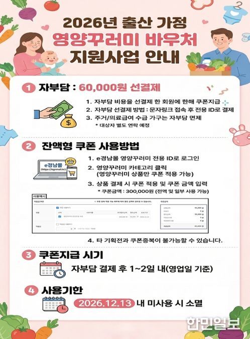 한민일보 서울포커스 임경복 기자 | 경상남도는 영아 출산가정의 건강한 식생활 지원과 경제적 부담 경감을 위해 ‘출산가정 영양꾸러미 바우처 사업’을 23일부터 본격 시행한다고 밝혔다.