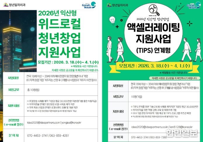 익산시는 '2026년 익산형 위드로컬 청년창업 지원사업'과 '2026년 익산형 청년창업 액셀러레이팅 지원사업(TIPS 연계형)' 참여자를 오는 4월 1일까지 모집한다고 20일 밝혔다.