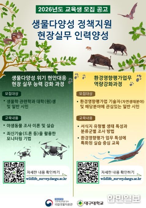 한민일보 서울포커스 진광성 기자 | 기후에너지환경부 소속 국립생물자원관은 3월 24일부터 ‘2026년 생물다양성 정책지원 현장실무 인력양성’ 교육 참가자 110명을 모집한다고 밝혔다.
