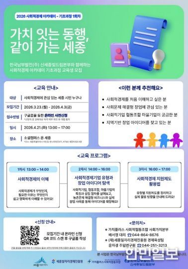 한민일보 서울포커스 임철현 기자 | 세종일자리경제진흥원이 한국남부발전㈜ 신세종빛드림본부와 협력해 지역 내 사회적경제 인재를 발굴하고 창업을 지원하기 위한 ‘2026 사회적경제 아카데미’를 운영한다.