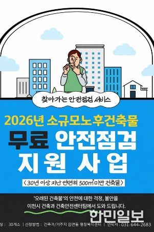 한민일보 서울포커스 박용남 기자 | 이천시는 건축물 노후화로 인한 안전사고를 예방하고 시민 안전을 강화하기 위해 ‘2026년 찾아가는 소규모 노후건축물 안전점검 지원사업’을 추진한다고 밝혔다.