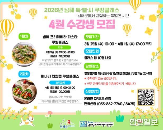 한민일보 서울포커스 김서윤 기자 | 남해군이 봄 제철 식재료를 활용해 군민들에게 특별한 미식 경험을 선사하는 쿠킹클래스를 마련하고 수강생 모집에 나선다.