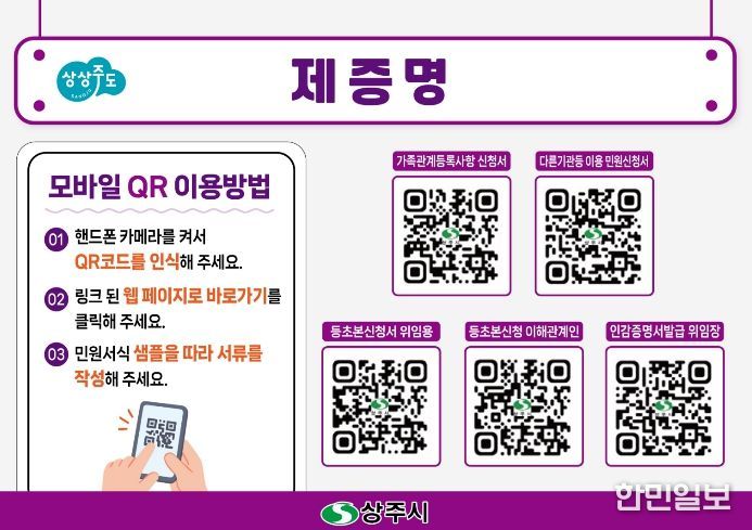 한민일보 서울포커스 김봉순 기자 | 상주시는 민원서식 작성에 어려움을 겪는 시민들의 불편을 해소하고 민원 처리의 편의성을 높이기 위해 QR코드를 활용한 ‘민원서류 작성 예시 안내 서비스’를 도입한다고 밝혔다.