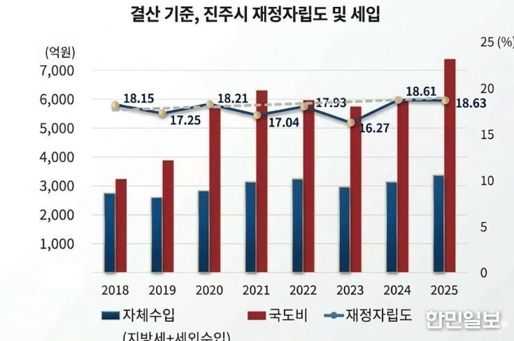 한편, 진주시의 결산 기준 재정자립도는 2018년 18.15%에서 2025년 18.63%를 기록하며 큰 변동 없이 유지되고 있다.