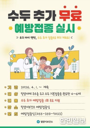 한민일보 서울포커스 김은금 기자 | 경남 밀양시는 봄철 수두 유행에 대응해 아동 건강 보호를 위해 전국 최초로 수두 추가 예방접종 사업을 시행한다고 25일 밝혔다.