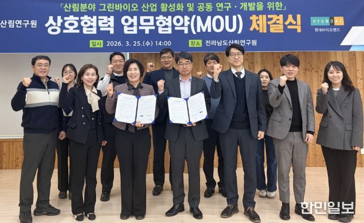 한민일보 서울포커스 임철현 기자 | 전라남도산림연구원이 25일 ㈜현대바이오랜드와 산림자원을 활용한 그린바이오 산업 활성화를 위해 업무협약을 하고, 고부가가치 제품 개발과 원물의 안정적 생산체계 구축을 위한 상호 협력에 나섰다.