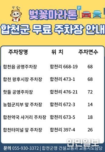 주차장 무료개방과 관련한 자세한 사항은 합천군 건설교통과 교통지도담당으로 문의하면 된다.