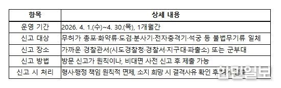 한민일보 서울포커스 최성훈 기자 | 경찰청은 불법무기류로 인한 범죄와 사고를 미리 방지하기 위하여 국방부 및 행정안전부와 합동으로 4월 1일부터 30일까지 한 달간 '2026년 1차 불법무기류 자진신고 기간'을 운영한다.