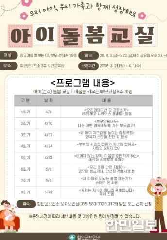 모집 대상은 영유아기 아동을 돌보는 함안군 거주 부모 및 조부모 15명으로, 선착순 모집하며 4월 1일까지 신청할 수 있다.