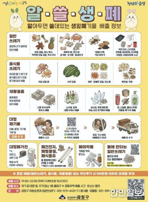 한민일보 서울포커스 임광현 기자 | 부산 금정구는 생활폐기물 배출에 대한 주민 불편을 해소하고 올바른 분리배출 문화 정착을 위해 ‘알‧쓸‧생‧폐’(알아두면 쓸데 있는 생활폐기물 배출 정보) 홍보지 제작에 나선다고 밝혔다.
