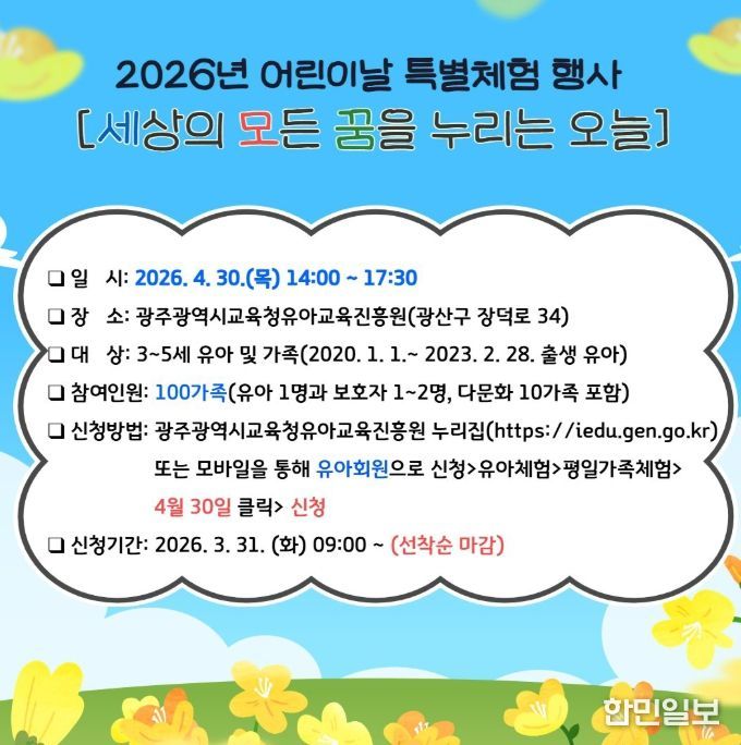 한민일보 서울포커스 임경복 기자 | 광주시교육청유아교육진흥원은 ‘제104회 어린이날’을 맞아 오는 4월 30일 본원 실내·외 체험영역 및 시청각실 등에서 어린이날 특별 가족체험 ‘세·모·꿈(세상의 모든 꿈을 누리는 오늘)’ 행사를 개최한다.