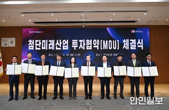 김태흠 지사는 30일 도청 대회의실에서 오세현 아산시장 등 3개 시군 시장·군수, 김동회 디앤알파트너스 대표이사 등 6개 기업 대표와 투자협약(MOU)를 체결했다.
