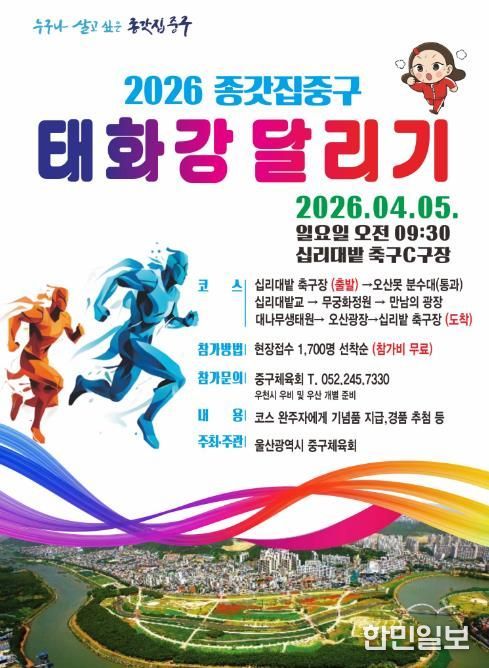 한민일보 서울포커스 기자 | 봄의 정취를 온몸으로 느낄 수 있는 ‘2026년 종갓집중구 태화강달리기’ 행사가 오는 4월 5일(일) 오전 9시 태화강국가정원 일원에서 열린다.