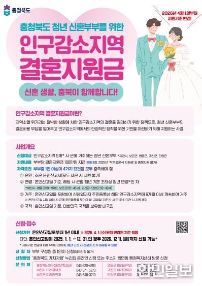 한민일보 서울포커스 임경복 기자 | 충북도는 도내 인구감소지역 청년 신혼부부의 안정적인 지역 정착을 지원하기 위해 추진 중인 ‘인구감소지역 결혼지원금’ 사업을 오는 4월 1일부터 전격 개편 시행한다.