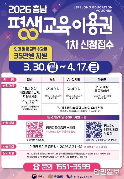 한민일보 서울포커스 황준형 기자 | 천안시는 시민의 평생교육 참여 기회 확대와 교육 격차 해소를 위해 다음 달 17일까지 ‘2026년 충남 평생교육이용권’ 1차 신청을 접수한다고 31일 밝혔다.