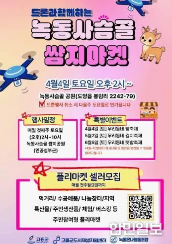 한민일보 서울포커스 임광현 기자 | 고흥군은 오는 4월 4일 녹동항 드론쇼 개막식과 연계해 도양읍 쌈지소공원에서 도시재생사업 일환으로 ‘녹동 사슴골 쌈지마켓’을 개최한다고 밝혔다.