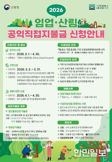 한민일보 서울포커스 박덕환 기자 | 충남도는 오는 30일까지 산지 소재지 읍·면·동 행정복지센터에서 ‘2026년 임업·산림 공익직접지불금’ 신청서를 접수받는다고 1일 밝혔다.