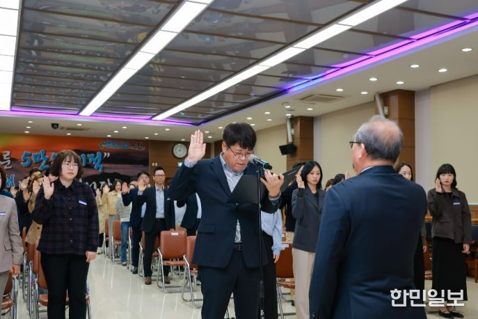 이날 직원 대표로 육안국 미래전략국장 선창에 따라 직원들은 친절과 봉사를 바탕으로 한 행정 서비스 실천에 대한 굳은 의지를 다졌다.