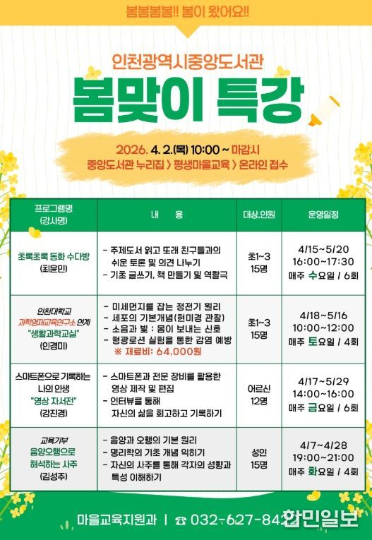 한민일보 서울포커스 유창렬 기자 | 인천광역시교육청중앙도서관은 4월부터 지역주민의 배움과 여가를 지원하기 위하여, 다양한 연령층을 대상으로 ‘봄맞이 특강’을 운영한다.