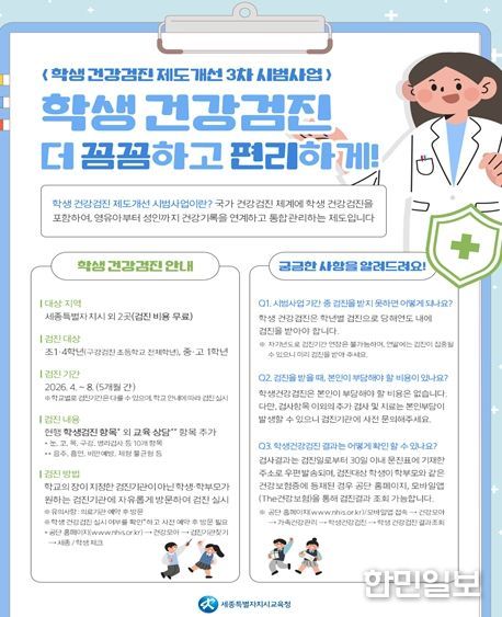 한민일보 서울포커스 임경복 기자 | 세종특별자치시교육청은 학생 건강검진 제도의 개선과 2027년 3월 전면 위탁 시행을 대비하여 ‘학생 건강검진 제도개선 3차 시범사업’을 추진한다.