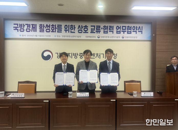 한민일보 서울포커스 곽중희 기자 | 강원특별자치도는 4월 1일 오후 2시 강원지방중소벤처기업청 중회의실에서 강원지방중소벤처기업청, 강원지방조달청과 함께 도내 중소기업의 군납시장 진출 지원과 국방경제 활성화를 위한 업무협약을 체결했다.
