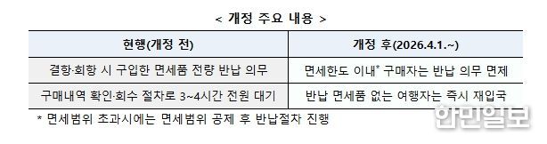 관세청은 지난 2월 말 면세품 회수 예외 근거가 「관세법 시행령」에 마련됨에 따라, 세부 이행 절차를 담은 「여행자 및 승무원 휴대품 통관에 관한 고시」 개정을 완료하고 4월 1일부터 본격 시행한다고 밝혔다.