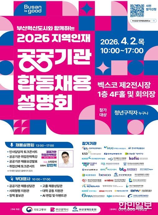 한민일보 서울포커스 임광현 기자 | 부산시는 오늘(2일) 오후 2시 벡스코 제2전시장에서 부산 혁신도시와 함께하는 '2026 지역인재 공공기관 합동채용설명회'를 개최한다고 밝혔다.