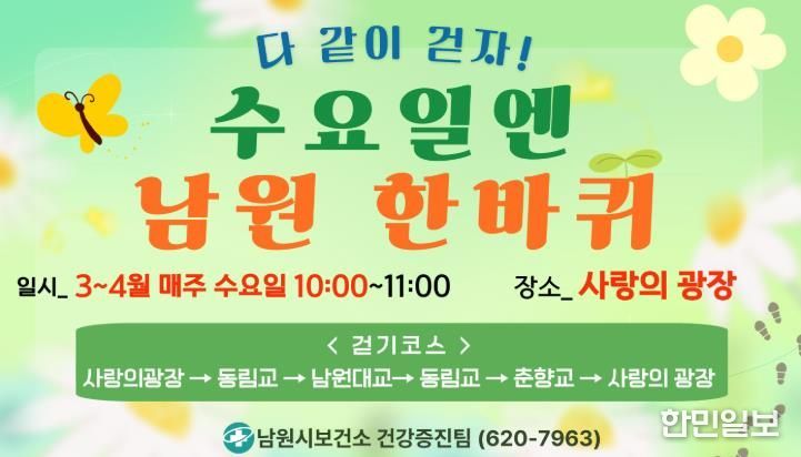 한민일보 서울포커스 박용남 기자 | 남원시보건소가 시민의 건강 증진과 일상 속 운동 습관 형성을 위해 오는 4월부터 11월까지 걷기 실천 프로그램인 ‘수요일엔 남원 한바퀴’를 운영한다.