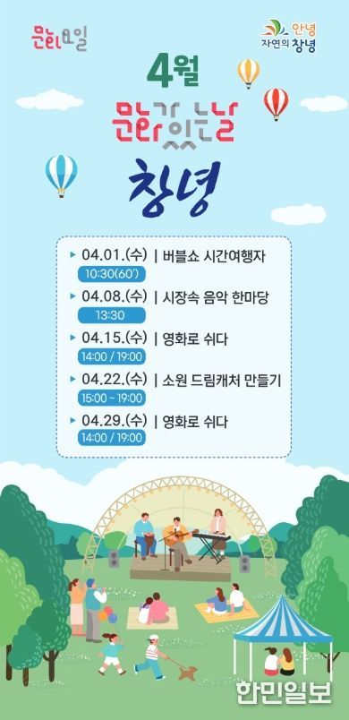 한민일보 서울포커스 김은금 기자 | 창녕군은 4월 한 달간 매주 수요일, 5월부터 11월까지는 첫째·셋째 주 수요일에 창녕문화예술회관에서 ‘2026 구석구석 문화가 있는 날’ 프로그램을 운영한다고 밝혔다.