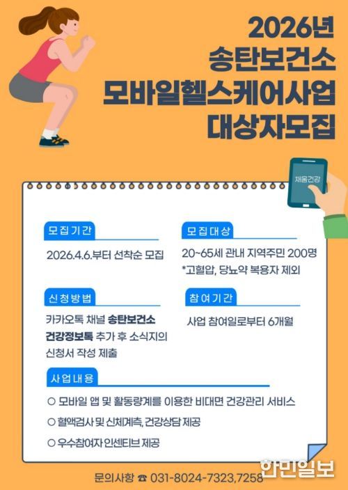 프로그램 참여를 희망하는 20~65세 관내 거주 시민(단, 고혈압 및 당뇨 질환자 제외)은 카카오톡 채널 ‘송탄보건소 건강정보톡’을 추가 후 신청서를 제출하면 된다. 자세한 사항은 전화로 문의하거나, 보건소 사업 안내와 다양한 건강 정보를 제공하는 평택·송탄보건소 유튜브 채널 ‘몸마음튼튼’에서 확인할 수 있다.