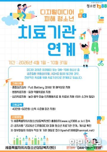 한민일보 서울포커스 김윤이 기자 | 세종특별자치시청소년상담복지센터는 지역사회 내 미디어 과의존 어려움을 겪고 있는 청소년들의 건강한 성장을 돕기 위해 4월부터 10월까지 미디어 과의존 청소년을 대상으로 치료기관(병원 등) 연계 서비스를 지원한다.