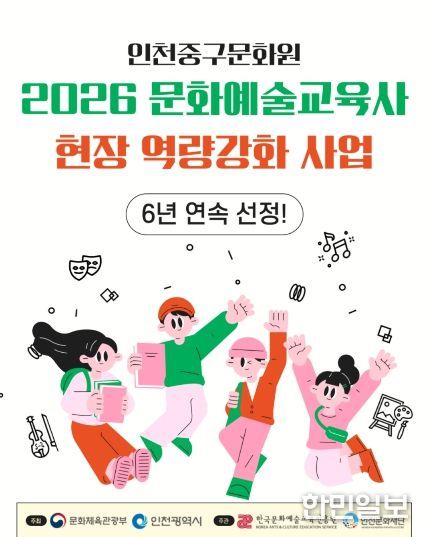 한민일보 서울포커스 김다남 기자 | 인천중구문화원(원장 박봉주)이 문화체육관광부와 인천광역시가 주최하고, 인천문화재단 인천문화예술교육지원센터와 한국문화예술교육진흥원이 주관하는 '2026 문화예술교육사 현장 역량강화 사업(인천)'에 6년 연속 선정되는 쾌거를 달성했다.