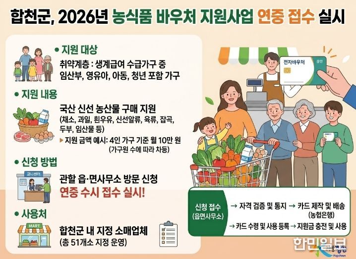한민일보 서울포커스 김은금 기자 | 합천군은 취약계층이 신선한 농산물을 쉽게 맛보고 건강한 식생활을 누릴 수 있도록 ‘2026년 농식품 바우처 지원사업’을 연중 추진하고 있다고 2일 밝혔다.