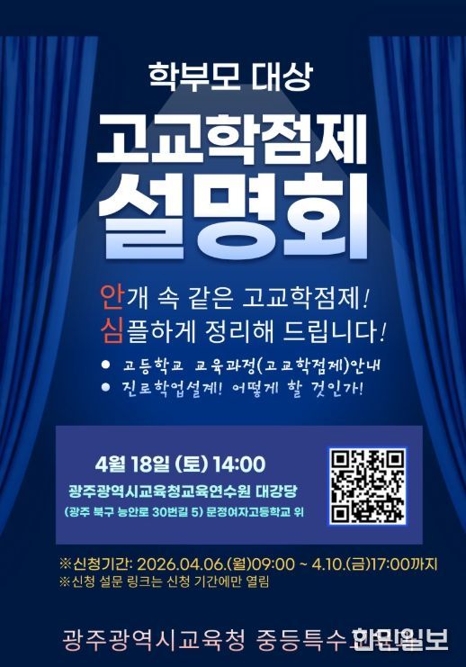 한민일보 서울포커스 임경복 기자 | 광주시교육청은 오는 18일 광주교육연수원 대강당에서 중학교 3학년 및 고등학교 1학년 학부모를 대상으로 ‘고교학점제 설명회’를 개최한다.