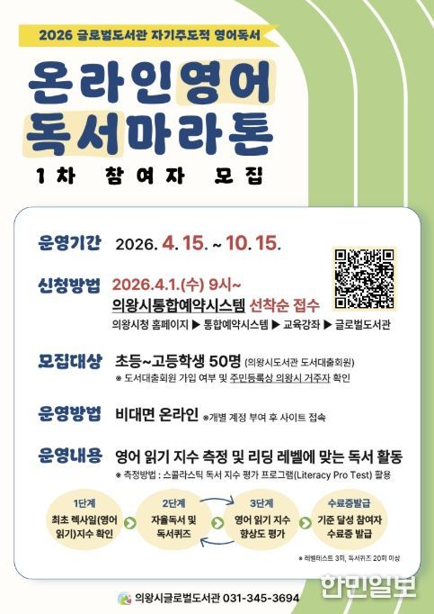 한민일보 서울포커스 전희주 기자 | 의왕시 글로벌도서관은 학생들의 영어 독서 흥미를 높이고 자기주도적 학습 습관 형성을 지원하기 위해 기획된 '온라인 영어독서마라톤'의 1차 참여자 50명을 모집하고 있다.