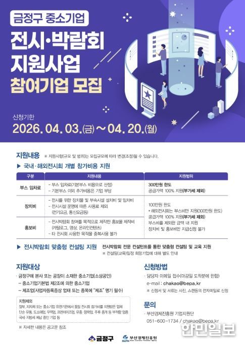 한민일보 서울포커스 임광현 기자 | 부산 금정구는 관내 중소기업의 판로 개척과 시장 경쟁력 강화를 위하여 ‘금정구 중소기업 전시박람회 참가 지원 사업’ 참여 기업을 오는 4월 20일까지 모집한다고 밝혔다.