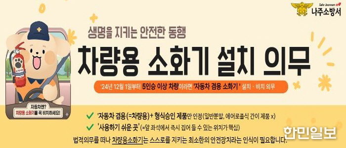 한민일보 서울포커스 임광현 기자 | 나주소방서는 차량 화재는 연료, 타이어, 시트 등 다양한 가연물로 인해 짧은 시간 안에 급격히 확대될 수 있어 차량용 소화기 비치의 중요성이 커지고 있다고 밝혔다.