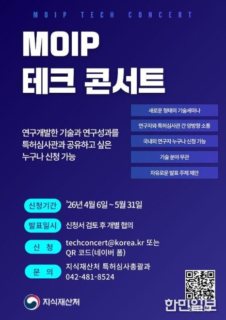 한민일보 서울포커스 기자 | 지식재산처는 4월 6일~5월 31일까지 기업 및 연구소가 개발하거나 연구한 최신 기술을 특허심사관과 공유하고, 연구자와 특허심사관과의 직접적인 소통을 강화하기 위한 ‘지식재산처(MOIP) 기술 공연(MOIP Tech Concert)'에 참여할 우수 연구자를 모집한다고 밝혔다.
