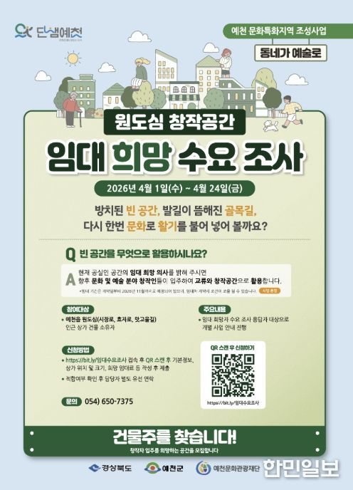 이를 위해 재단은 오는 24일까지 예천읍 원도심 소재 공간을 창작공간으로 임대하길 희망하는 건물주를 대상으로 수요 조사를 진행 중이며, 조사 결과는 향후 창작자가 활동공간을 선택할 때 참고 자료로 활용될 예정이다.