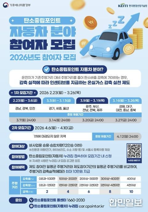 ‘자동차 탄소중립포인트제’는 참여 전 일평균 주행거리와 참여 기간의 일평균 주행거리를 비교해 감축 실적에 따라 2만 원에서 최대 10만 원까지 인센티브를 지급하는 제도다. 대상은 12인승 이하 비사업용 승용ㆍ승합차 소유자다.