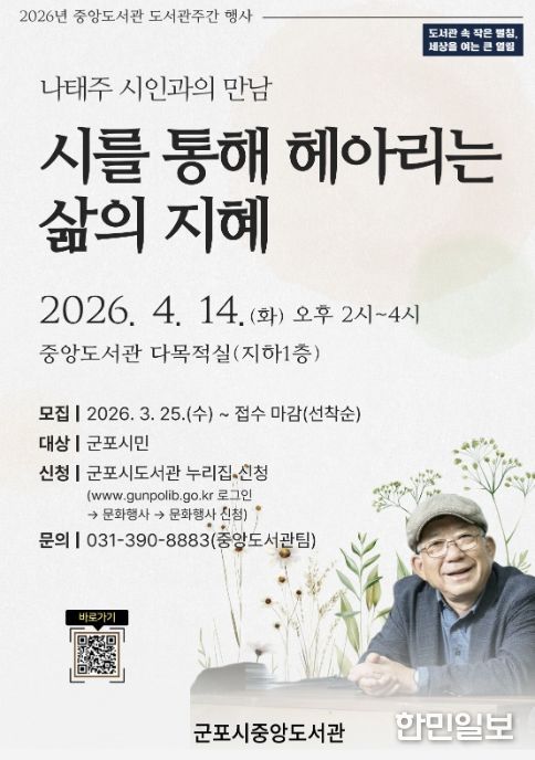 한민일보 서울포커스 임경복 기자 | 군포시중앙도서관은 제62회 도서관주간을 맞아 시민들이 시를 통해 삶의 여유와 위로를 느낄 수 있도록 나태주 시인과 함께하는 특별 프로그램을 운영한다.