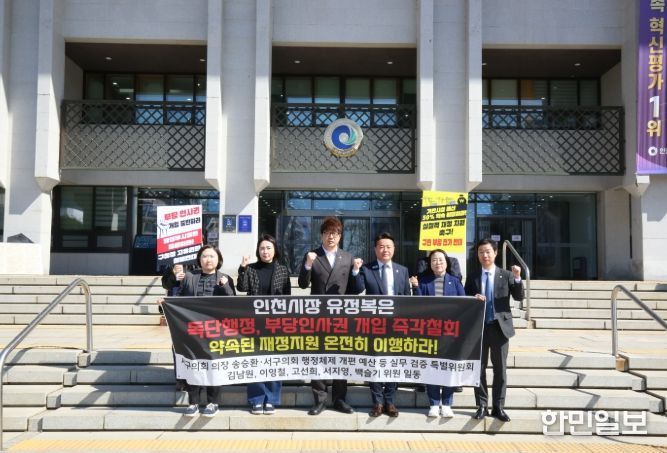 한민일보 서울포커스 김용택 기자 | 인천 서구의회 '행정체제 개편 예산 등 실무 검증 특별위원회'는 7일 오전 인천시청 본관 계단 앞에서 기자회견을 열고 검단 분구의 성공적인 안착을 위한 인천시의 재정지원 약속 이행과 자치권 침해 중단을 촉구했다.