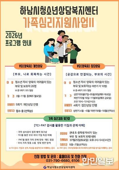 신청 대상은 하남시 관내 청소년(만 9세~24세) 자녀를 둔 부모(양육자) 및 가족이며, 자세한 내용과 신청 방법은 하남시청소년상담복지센터 홈페이지 또는 전화를 통해 안내받을 수 있다.