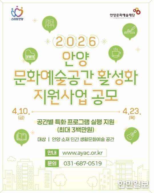 한민일보 서울포커스 김성윤 기자 | 안양문화예술재단은 지역 내 민간 생활문화예술 공간의 자립 기반을 강화하고 문화시민을 육성하기 위한 '2026 문화예술공간 활성화 지원사업' 참여 공간을 공개 모집한다고 8일 밝혔다.