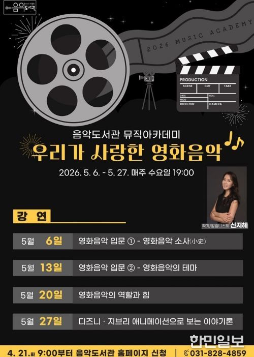 한민일보 서울포커스 심기옥 기자 | 의정부음악도서관은 5월 6일부터 27일까지 매주 수요일 오후 7시, 상반기 뮤직아카데미 ‘우리가 사랑한 영화음악’을 운영한다.
