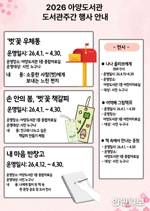 한민일보 서울포커스 임경복 기자 | 안성시 아양도서관은 ‘2026년 도서관의 날’ 및 ‘도서관 주간’을 맞아 오는 4월 15일부터 25일까지 ‘연결고리’를 주제로 다채로운 행사를 운영한다.