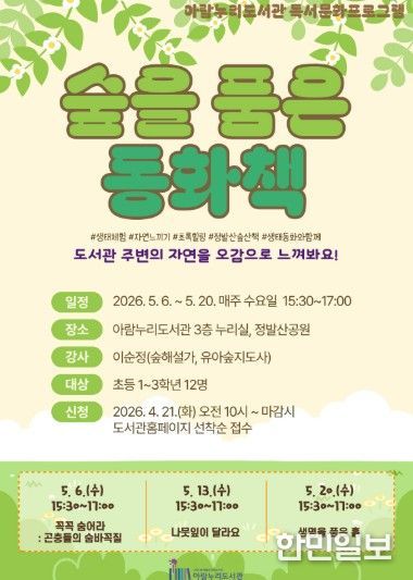 한민일보 서울포커스 김은금 기자 | 고양특례시 아람누리도서관이 오는 5월, 어린이들이 책 속 이야기를 자연 현장에서 직접 체험하며 생태 감수성을 키우는 독서문화 프로그램 ‘숲을 품은 동화책’을 운영한다.
